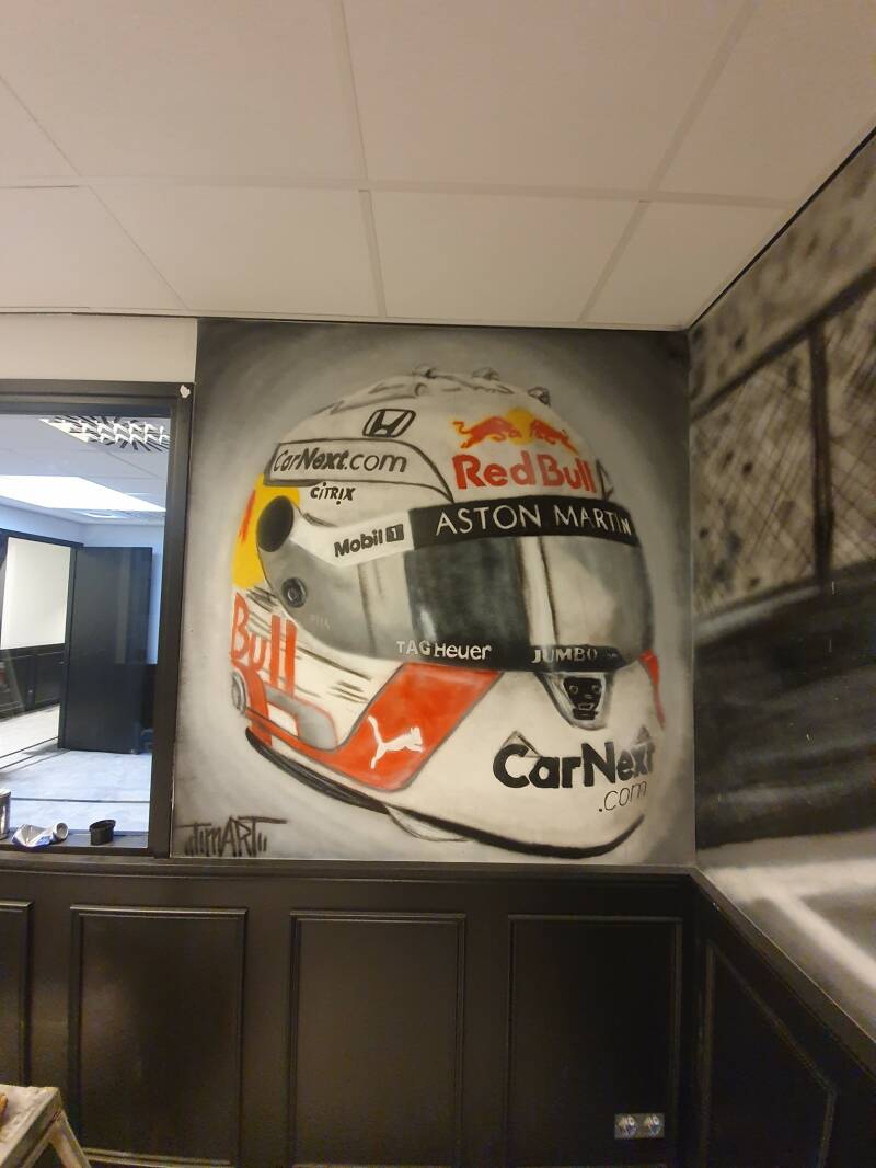 Deze ruimte gaat gebruikt worden als gamekamer en daar maakte ik een drieluik. Aan de ene kant kwam een helm van Max Verstappen. In het midden maakte ik een startgrid, waar ook de tv kwam te hangen. Aan de andere kant kwam Max in de auto die donuts aan het draaien is.